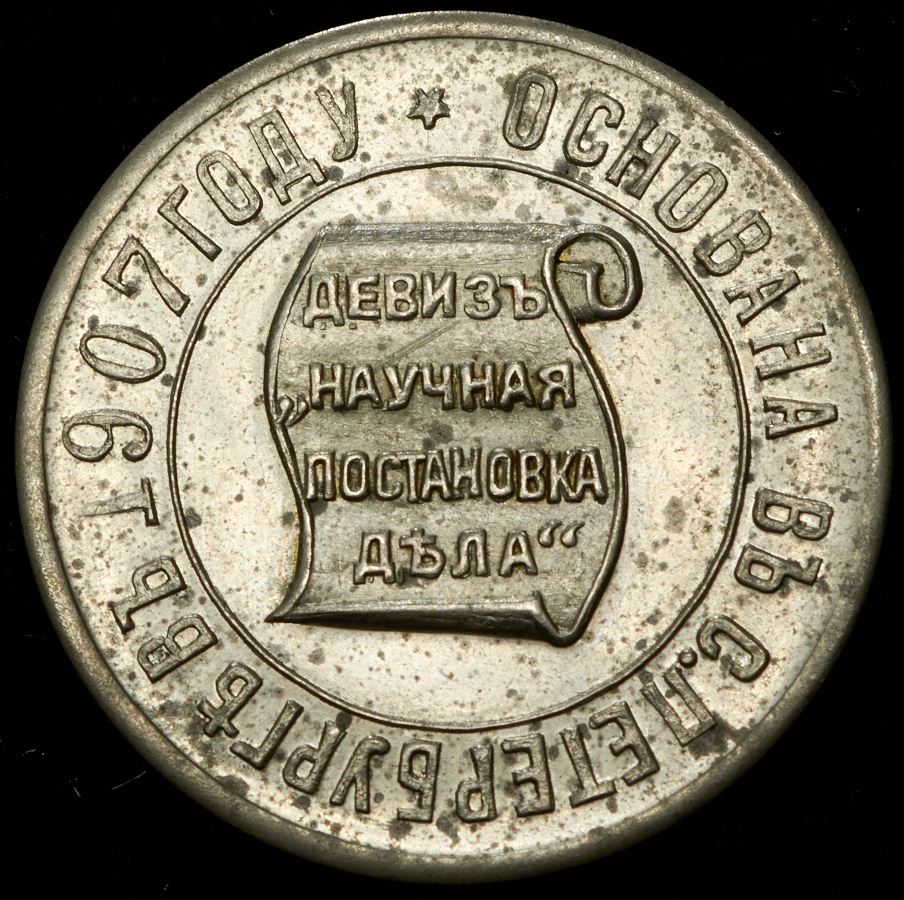 Жетон в память основания первой русской специально нумизматической фирмы "Монеты и Медали" в Санкт-Петербурге в 1907 году.
