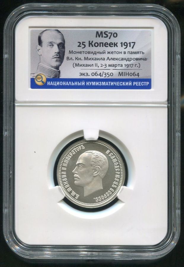 На аверсе размещен портрет Великого Князя Михаила Александровича, юридически - последнего правителя Российской империи.