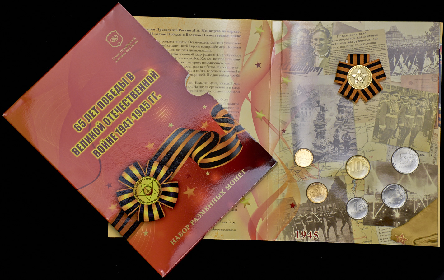 Официальный набор Санкт-Петербургского монетного двора, посвященный 65-летию победы в Великой Отечественной войне. Состоит из памятного знака и шести монет 2010 СПМД.