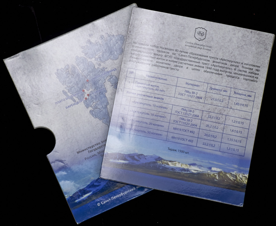 Наборплатежных юбилейных жетонов «Арктикуголь» остров Шпицберген, выпущенный в 2012 г. по специальному заказу ФГУП Государственного треста «Арктикуголь» по случаю юбилея объединения. Тираж 150 шт. В набор входят четыре платежных жетона-боны и памятный жетон. В оригинальном буклете.
