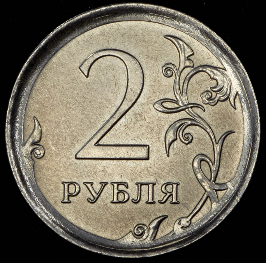 Брак чекана: монета отчеканена на 5-рублевой заготовке штемпелем аверса 5 рублей и штемпелем реверса 2 рублей. Продукция Московского монетного двора.