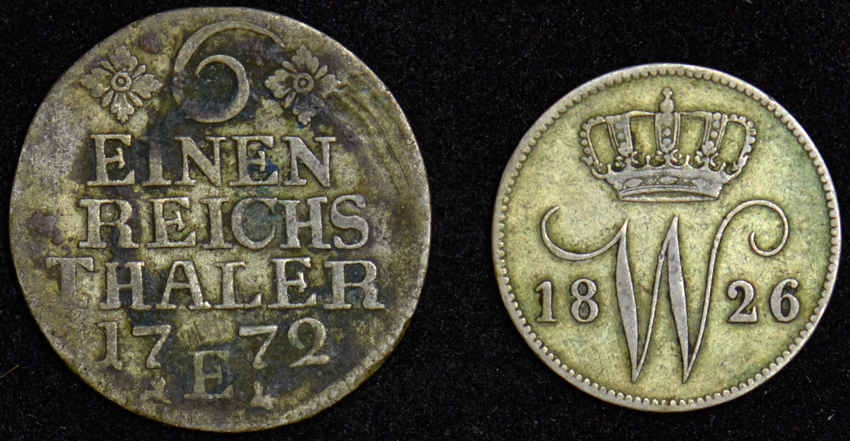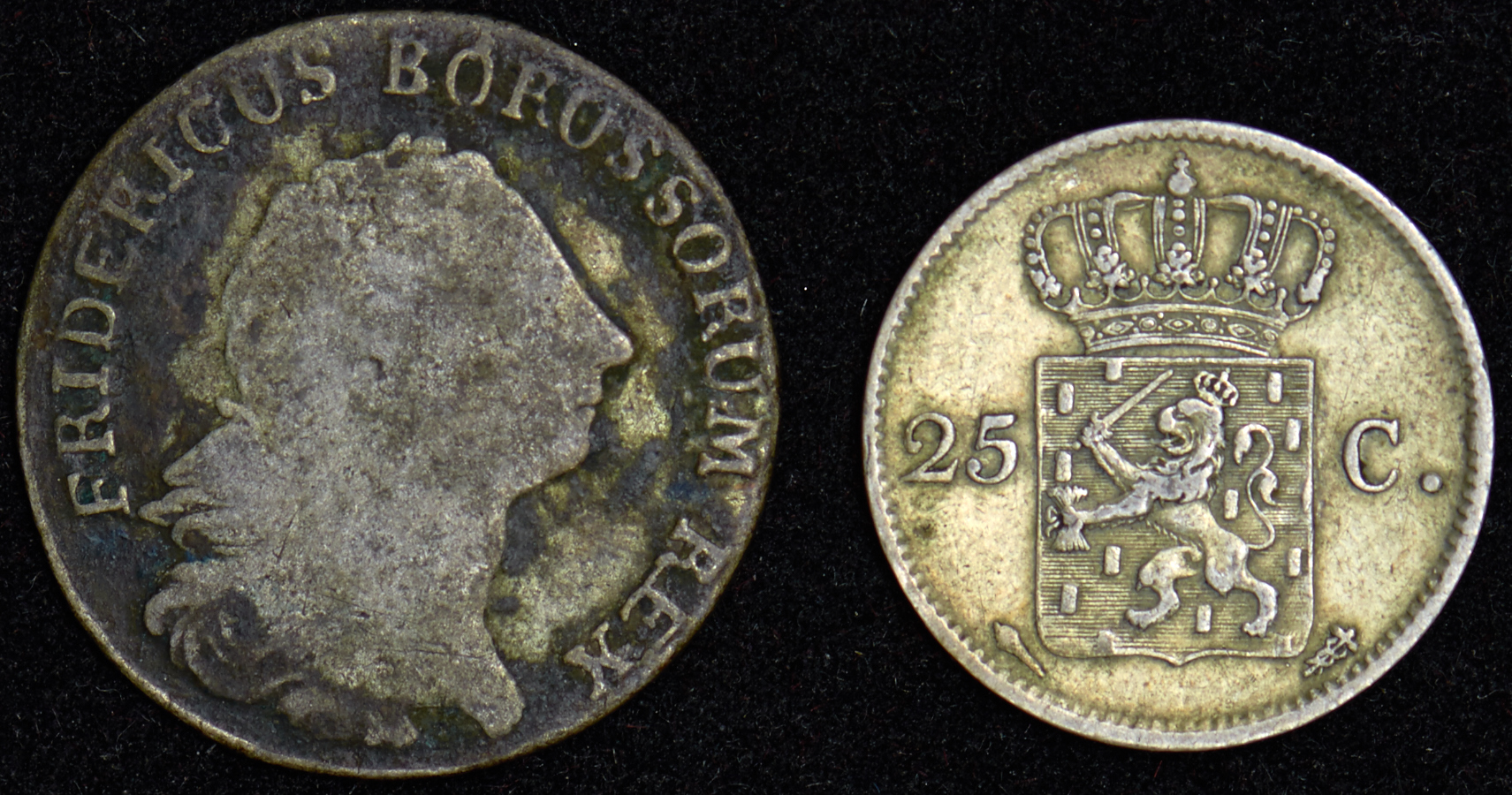В набор вошли:1) 1/6 талера 1772 (Пруссия).2) 25 центов 1826 (Нидерладны).Сохранность F-XF.