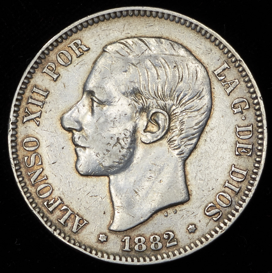 KM# 688.Серебро 900 пробы.Легенда аверса "ALFONSO XII POR LA G·DE DIOS".