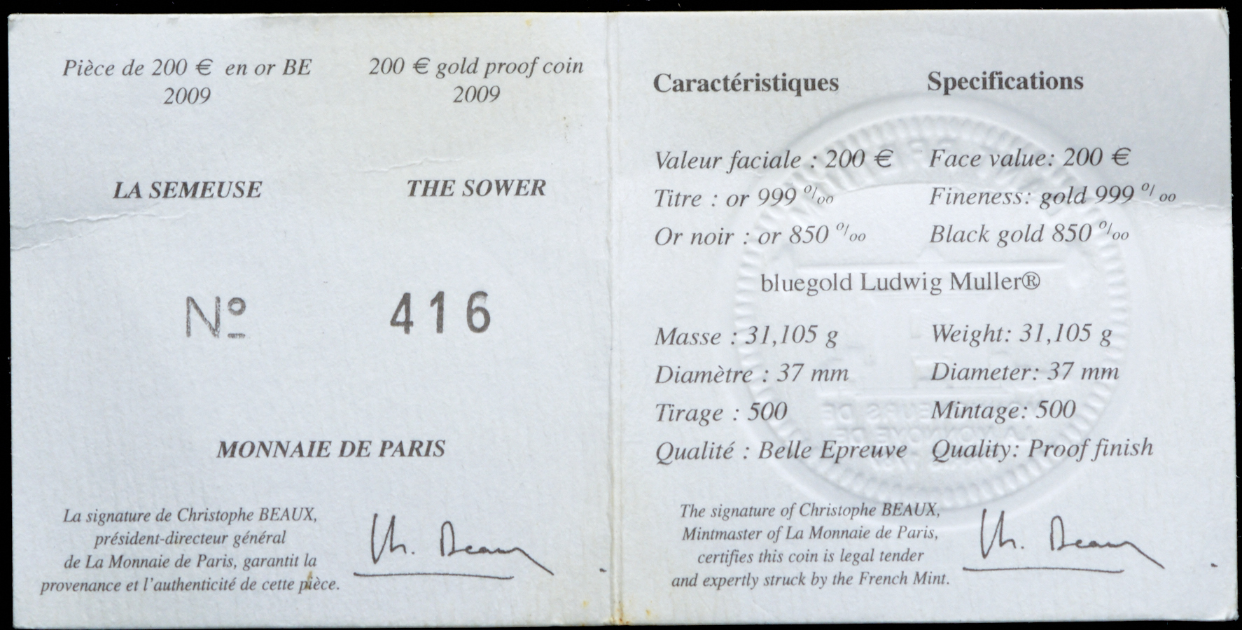 С оригинальным сертификатом №416.
