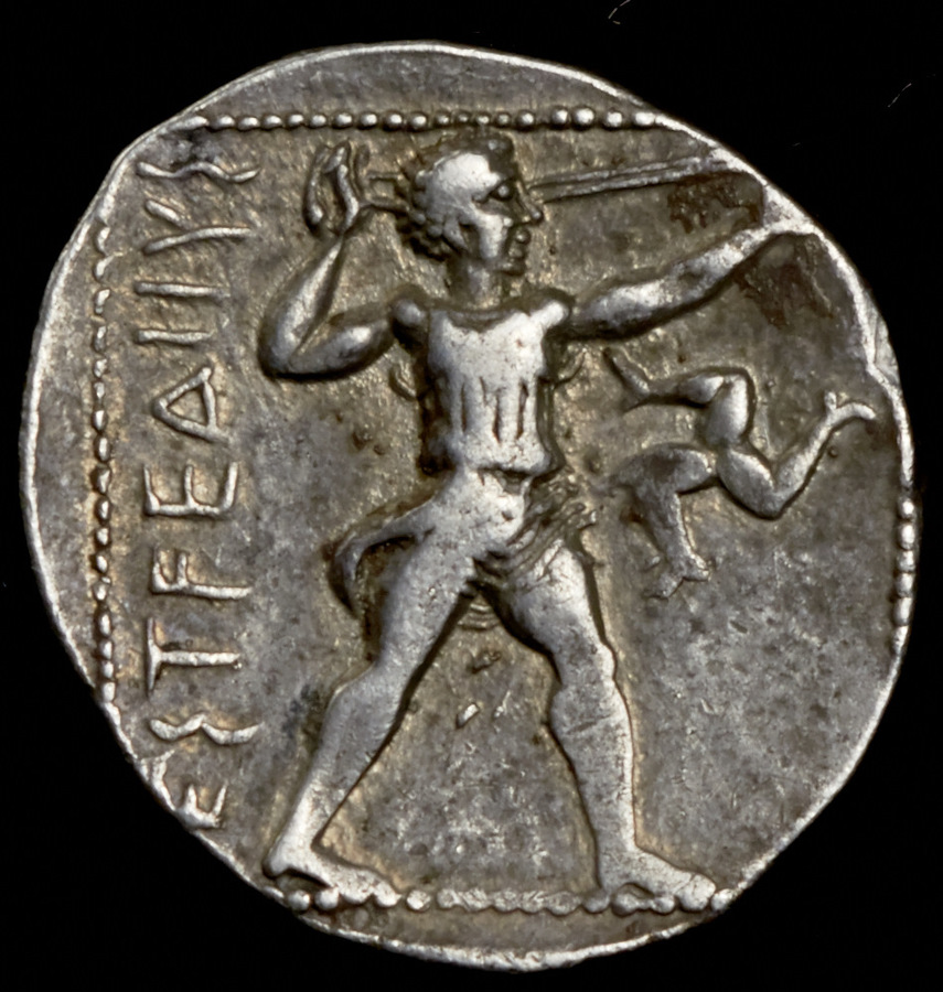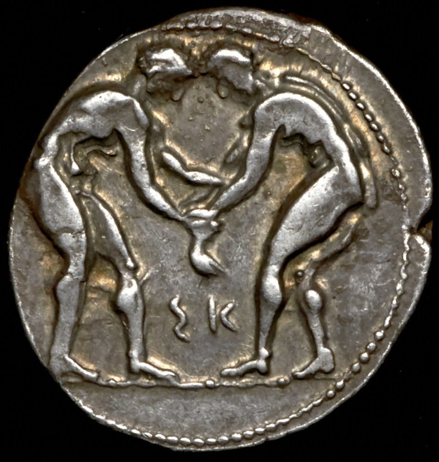 400-380 гг. до н.э.Изображение двух борцов. На другой стороне Пращник и трискелион.