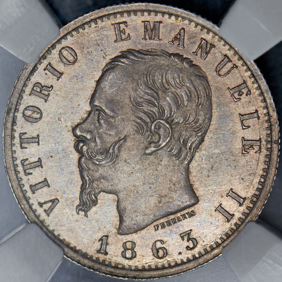 Пробный оттиск 1876 года на кружке размером с монету в 20 копеек с портретом короля Италии Виктора Эммануила II.
