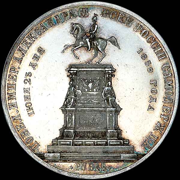 Чеканен по случаю открытия монумента императору Николаю I в Санкт-Петербурге. Надпись в обрезе шеи: "А.ЛЯЛИН". Выпуклый чекан.