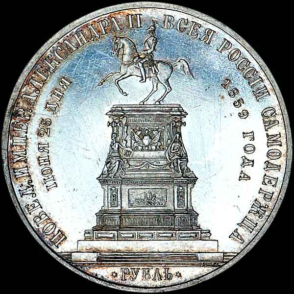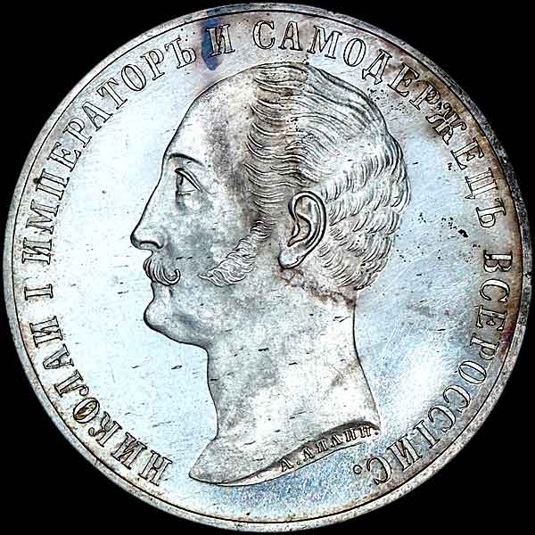 Чеканен по случаю открытия монумента императору Николаю I в Санкт-Петербурге. Надпись в обрезе шеи: "А.ЛЯЛИН". Плоский чекан.