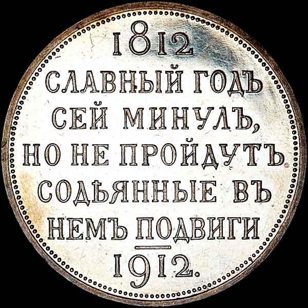 Чеканен в честь 100-летия победы в Отечественной войне 1812 года.