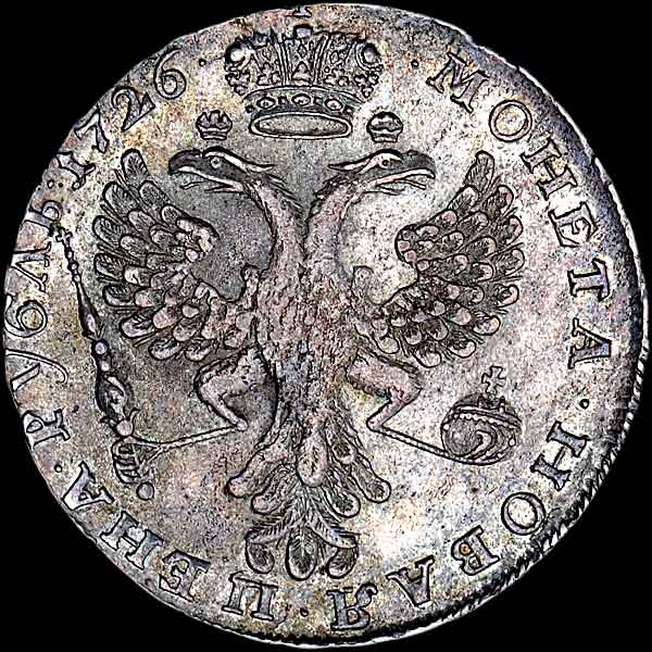Красный Монетный Двор. Портрет влево. Орел образца 1726 года. Малые короны у орла без крестов.