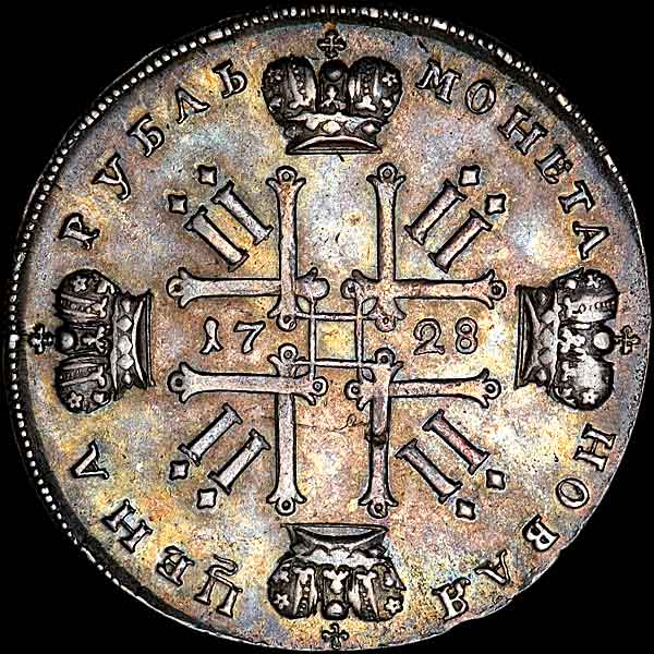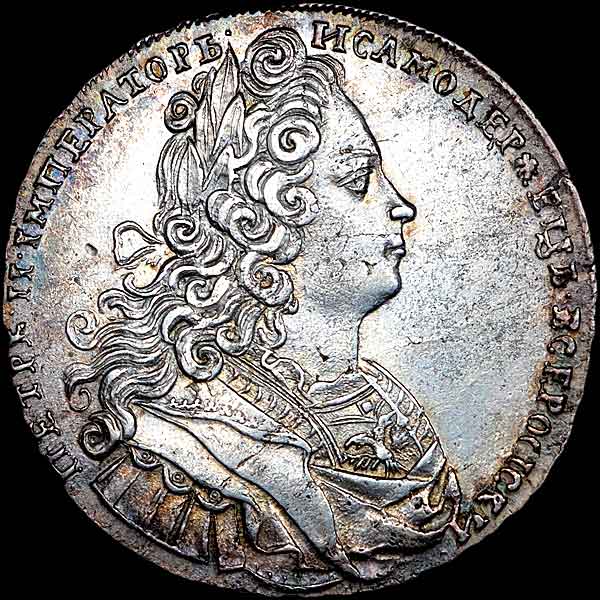 Кадашевский Монетный Двор. Без ордена на груди. Портрет образца 1727 года. С бантом в прическе. После слова "ИМПЕРАТОРЬ" точка. С надписью ".новаЯ." Надпись реверса ничем не разделена.