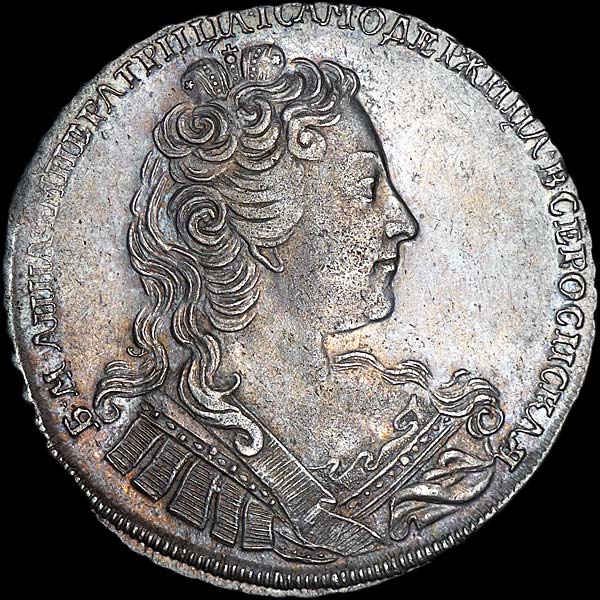Кадашевский Монетный Двор. Край корсажа не параллелен окружности. Точки разделяют надпись реверса. Корона больше.