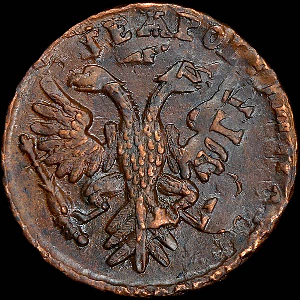 Перечекан из копейки 1713 года без букв монетного двора. Красный Монетный Двор. Крест державы узорчатый. 2 линии над датой.