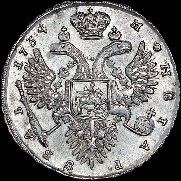 Кадашевский Монетный Двор. Портрет образца 1731-33 годов. Без броши на груди. В нижней ленте 3 трилистника. Цифра 4 в дате перегравирована из цифры 3.