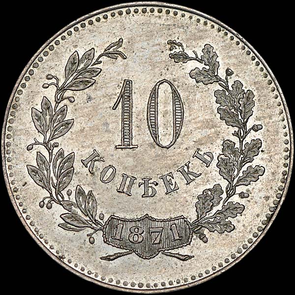 10 копеек 1871 года, без обозначения монетного двора. Пробная. Новодел.