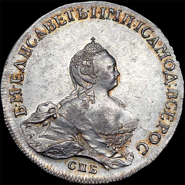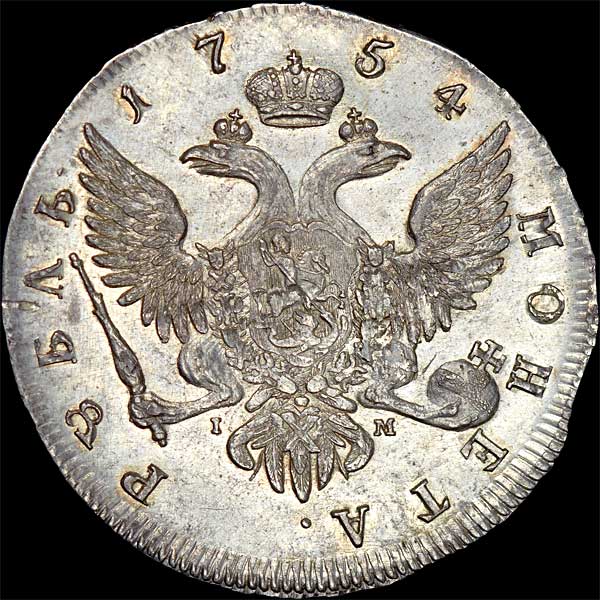MS 62. Красивый штемпельный блеск, глянцевитое поле. Лёгкая золотистая патина. Прекрасный образец непростого в высоких качестве и сохранности «медального» высоко-рельефного рубля. Этот вариант штемпеля работал только в 1754 году. Великолепный коллекционный экземпляр. Редка в подобном состоянии.
