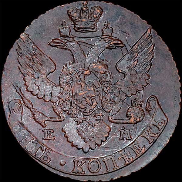 AU 58. Поверхность плотная, частичный штемпельный блеск, характерная для монет данного типа коричневая, слегка пятнистая патина.