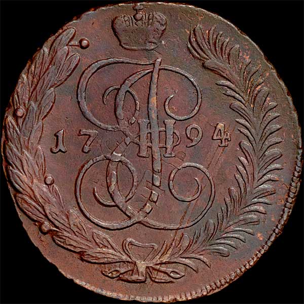 AU 50. Глубокая красно-коричневая патина. Классическая редкость среди пятикопеечников «Павловского перечекана». Отличный коллекционный экземпляр.