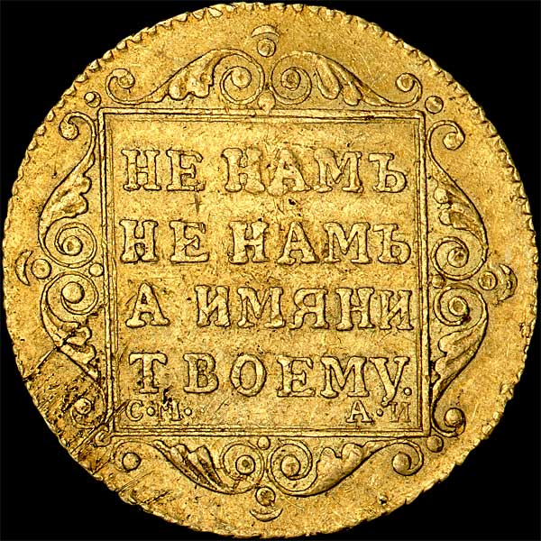 XF 40. Несмотря на довольно большой тираж, 5-ти рублёвые монеты Павла I очень редки, поскольку большая часть тиражей была из-за соответствия пробы сплава в 1814 году переплавлена для чеканки дукатов, необходимых Российской армии, находившейся в Европе. Добротный коллекционный экземпляр.