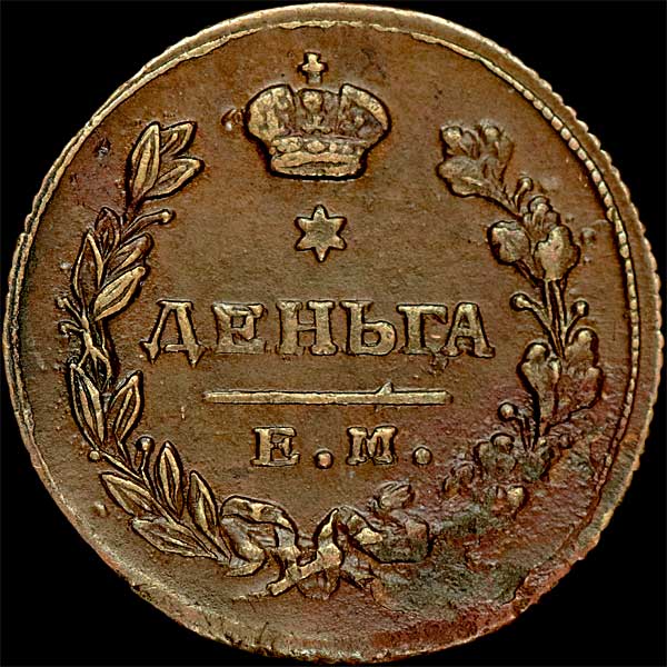 AU 55. Минимальная непрочеканка центральной части. Частичный штемпельный блеск, ореховая патина. Редка. Единственная деньга этого типа, имеющая шнуровидное оформление гурта. Отличный коллекционный экземпляр.