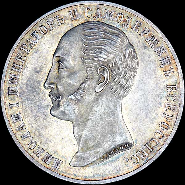 Чеканена по случаю открытия монумента императору Николаю I в Санкт-Петербурге. В обрезе портрета: «А.Лялин.». Выпуклый чекан.