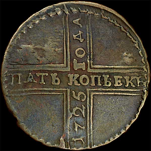 XF 45. Многочисленные следы разрушения штемпеля. Небольшая общая потёртость, множественные мелкие следы обращения. Лёгкая ореховая патина по неокисленному металлу. Редко встречаемая в этом состоянии монета. Отличный коллекционный экземпляр.