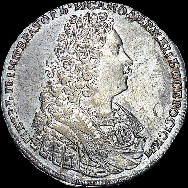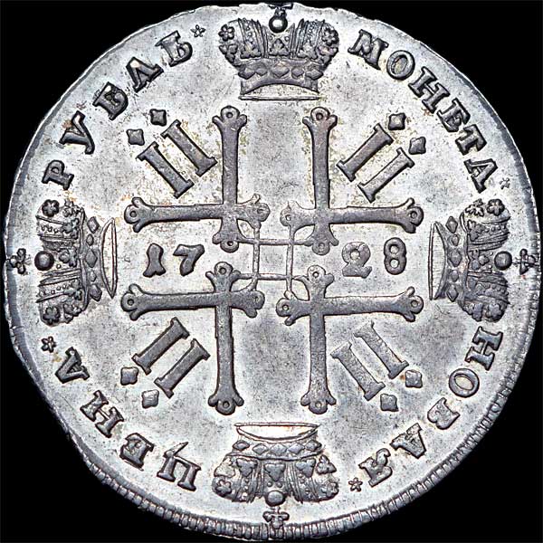 Кадашевский Монетный Двор. Портрет образца 1728 года, со звездой на груди. В конце надписи аверса ничего. Звезды разделяют надпись реверса.