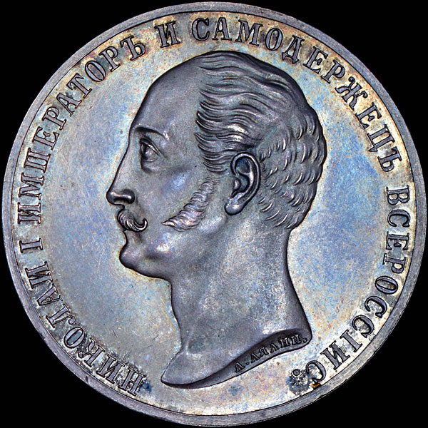 Чеканена по случаю открытия монумента императору Николаю I в Санкт-Петербурге. В обрезе портрета: "А.Лялин.". Выпуклый чекан.