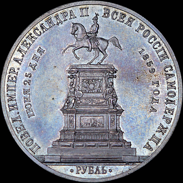 MS 63. Великолепное состояние. Глянцевитое поле, яркий штемпельный блеск. Серовато-бежевая коллекционного хранения патина. Памятные монеты 1859 года высокого (медального) рельефа встречаются значительно реже обычных рублей.