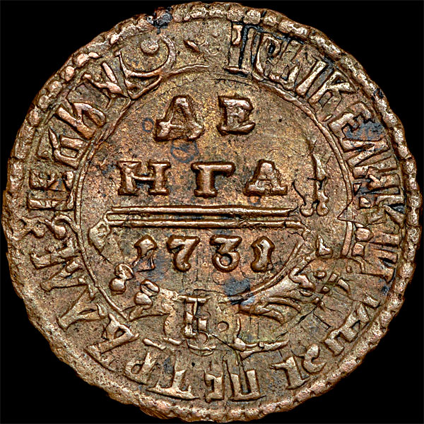 AU 50. Неравномерная желтовато-коричневая патина. Интересный красивый перечекан из большой копейки Петра I.