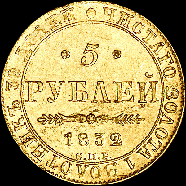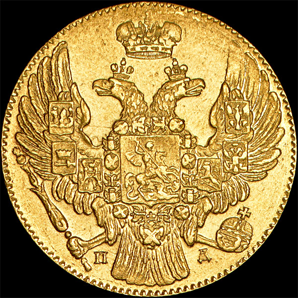 Золото 6,47 г. Уздеников 208 (–). Биткин 7. AU 55. Остаточный штемпельный блеск. Довольно редка.