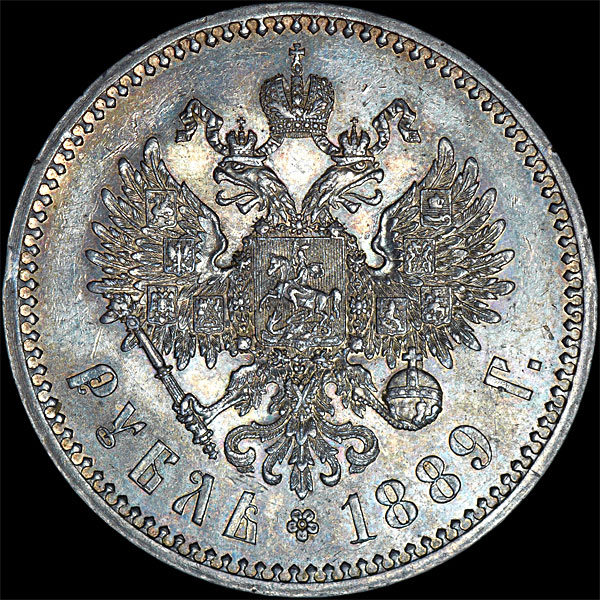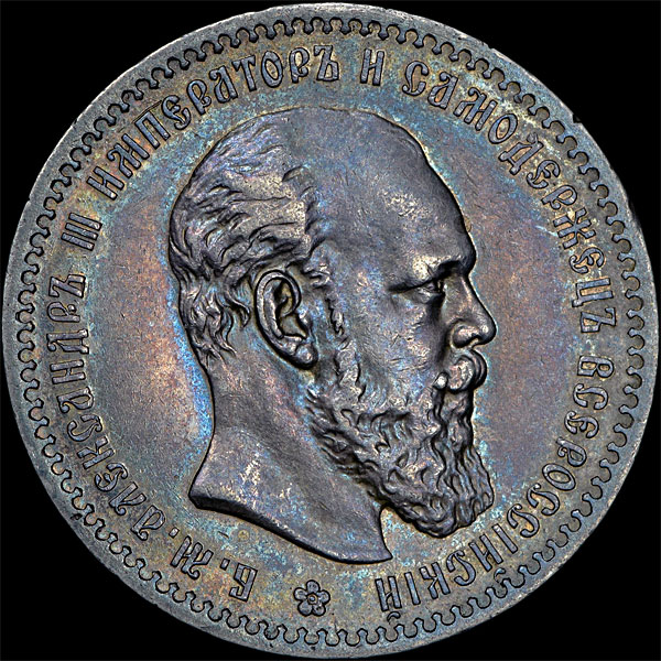 MS 61. Превосходное состояние для данного типа и года. Глянцевитое поле, штемпельный блеск. Темная полихромная длительного коллекционного хранения патина. Самый редкий годовой рубль императора Александра III. Крайне редка, особенно в подобной сохранности.