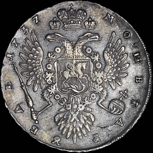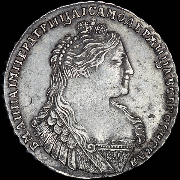 Кадашевский Монетный Двор. Портрет образца 1734-37 гг. Без кулона из 3 жемчужин на груди. Двоеточие в начале круговой надписи аверса и точка в конце. 8 жемчужин в волосах.