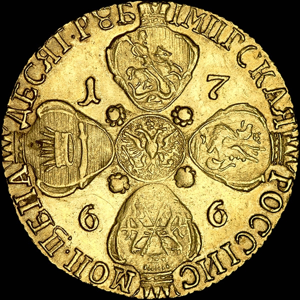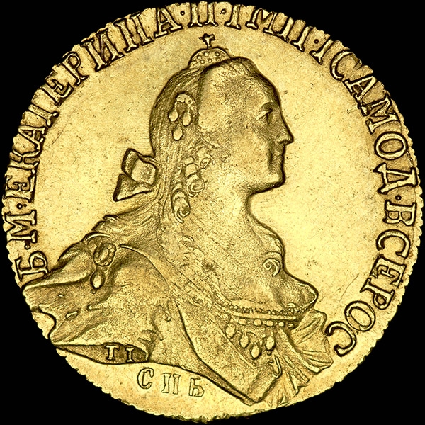MS 60. Превосходное состояние для этого подтипа. Легкий штемпельный блеск. 10-рублевые монеты Екатерины II "грубого" чекана в подобной сохранности встречаются крайне редко.