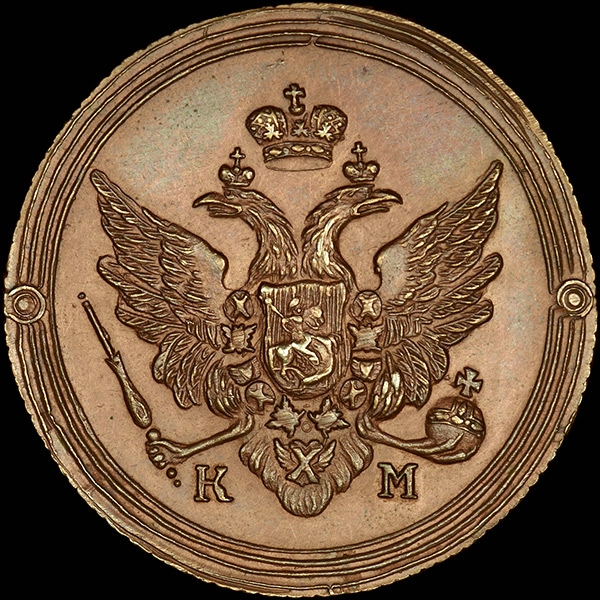 MS 64. Красно-коричневая патина. Яркий штемпельный блеск. Превосходный коллекционный экземпляр. Очень редка. Данный тип монет известен только в виде новоделов.