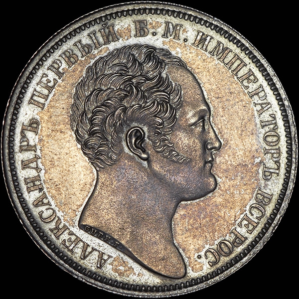 Чеканена по случаю открытия Александровской колонны в Санкт-Петербурге. В обрезе портрета "GUBE F.".