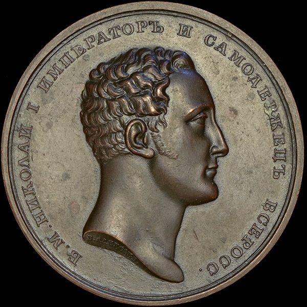 Гравер В.Алексеев. В каталоге Дьякова подобная медаль отсутствует. Автор упоминает медаль данного большого диаметра без подписи и медаль с подписью В.Алексеева но среднего (41мм) диаметра.