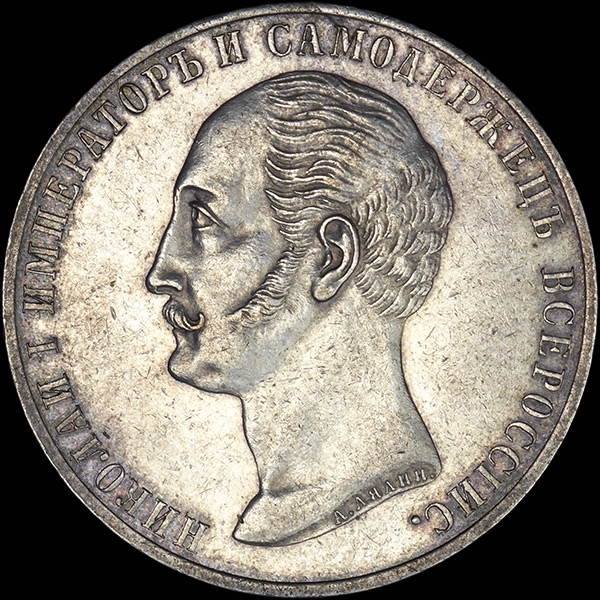 Чеканена по случаю открытия монумента императору Николаю I в Санкт-Петербурге. В обрезе портрета "А.Лялин". Плоский чекан.