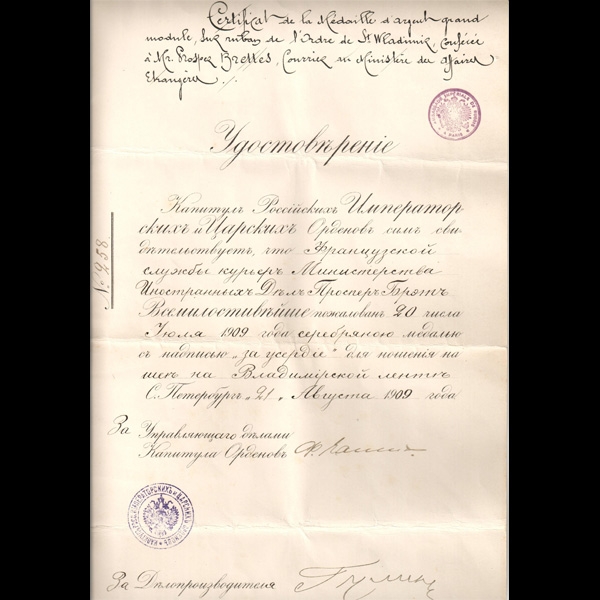 С удостоверением о всемилостивейшем пожаловании на имя Проспера Брэта.