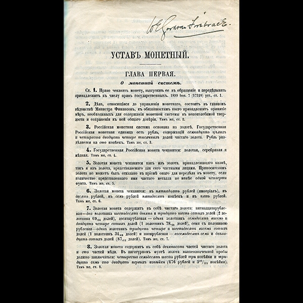 Входит в VII том Свода законов. Представляет из себя свод правил, установленных государством и определяющих тип выпускаемых монет, пробу и вес монетного металла, ремедиумы. В нем описывались правила приема монеты в качестве платежей, регламентировался прием испорченной монеты в казну. А так же устанавливались основные положения, относящиеся к деятельности Санкт-Петербургского монетного двора.
