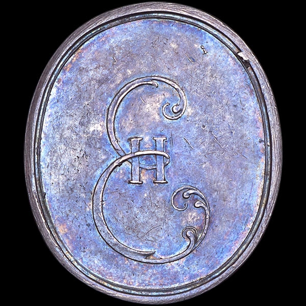 Глянцевитые поля. Оригинальная кабинетная патина с ярким синеватым отблеском. Старинные овальные медали XVIII в., чеканенные в серебре, очень редки.