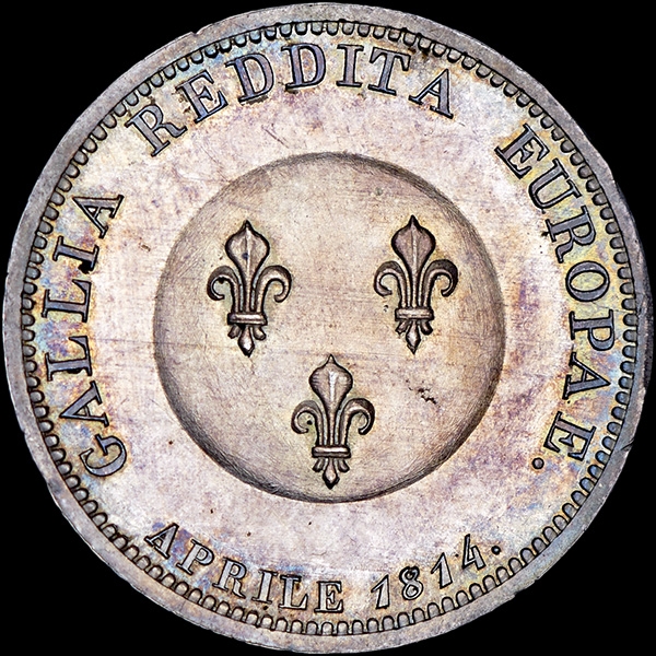 MS 66 PL. После триумфального вхождения русских войск в Париж в марте 1814 г. на Парижском монетном дворе были отчеканены несколько типов медалей в честь императора Александра I. Данная медаль аналогична по размеру двухфранковой монете. Легенда аверса "AU PACIFICATEUR DE L'EUROPE." (Миротворцу Европы). Легенда реверса "GALLIA REDDITA EUROPAE" (Франция возвращена Европе).