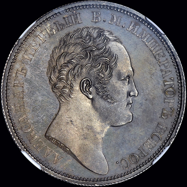 Чеканена по случаю открытия Александровской колонны в Санкт-Петербурге. В обрезе портрета "GUBE F.".