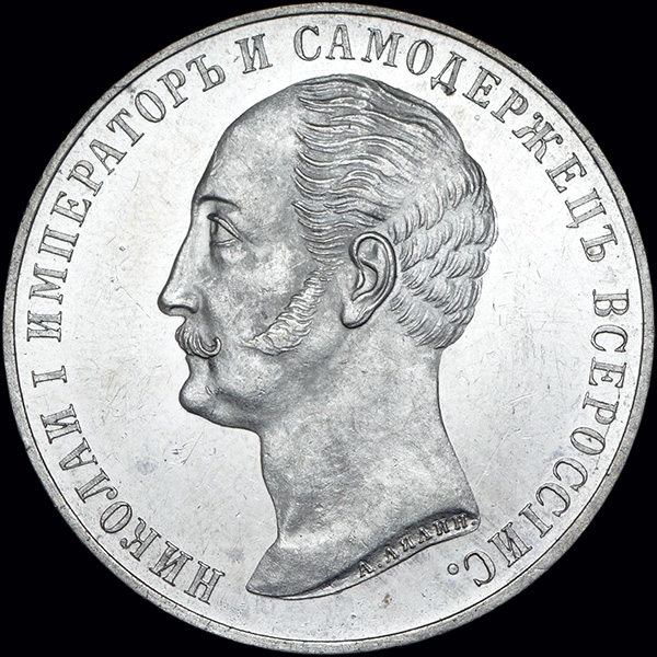 Чеканена по случаю открытия монумента императору Николаю I в Санкт-Петербурге. Плоский чекан. В обрезе портрета "А.Лялин". Справа в основании памятника "ВА".