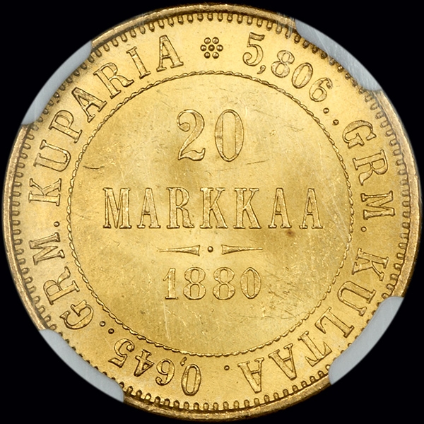 MS 64. Самая редкая монета номиналом 20 марок в период правления императора Александра II.