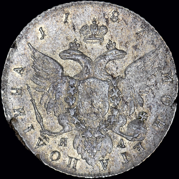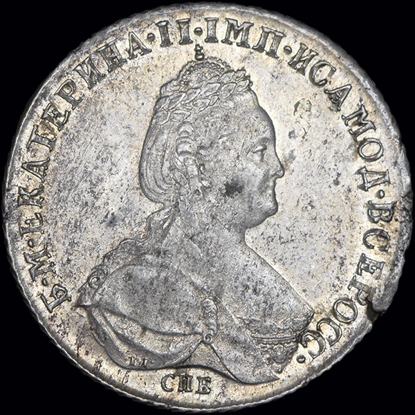 MS 60. Великолепное состояние для данного типа. Яркий штемпельный блеск. Полтины периода правления Екатерины II в отличной сохранности встречаются значительно реже подобных монет рублевого достоинства.
