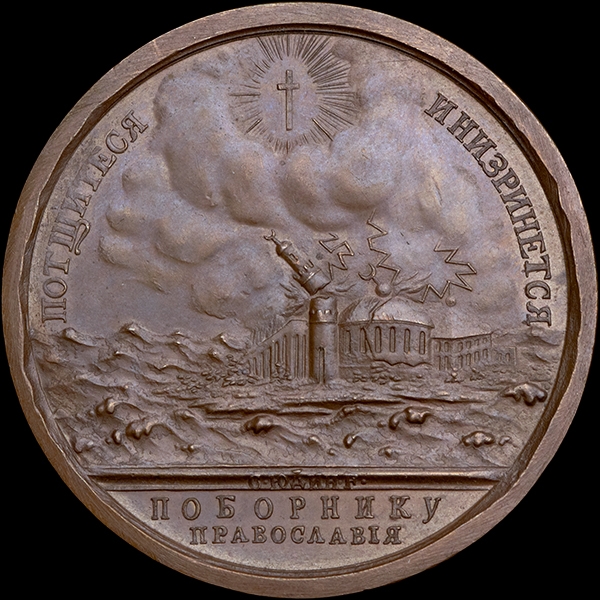 Эта медаль разных достоинств была задумана для награждения участников Архипелагской экспедиции (военная операция во время Русско-турецкой войны 1768‑74 гг.). Выпуск медалей, как и вся экспедиция, готовился в тайне. А в последствии большая их часть была уничтожена по высочайшему повелению Её Императорского Величества.