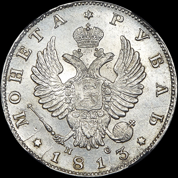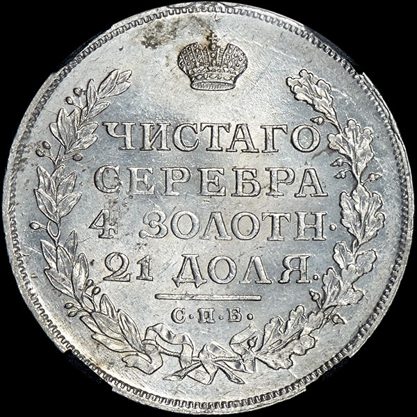 Серебро. Орел образца 1814 года: скипетр длиннее, корона больше. Уздеников 1407. Биткин 105. MS 62. Отличный коллекционный экземпляр. В слабе RNGA.