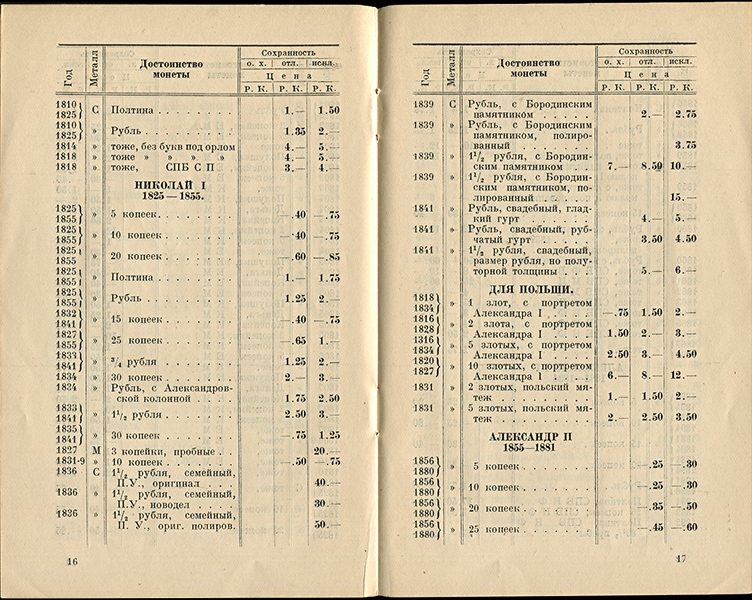 Прейскурант Советской Филателистической Ассоциации. Указаны цены на монеты в 3-х состояниях, преимущественно императорского периода, за которые ассоциация готова была продавать монеты с отправкой по почте адресатам из СССР. Так же приводятся цены на серебряные и медные медали Императорского периода, на античные монеты и западно-европейские.